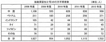 実習生の行方がわからなくなった場合、実習生を受け入れる監理団体などが、地方入国管理局に報告することになっている。しかし、取り締まる東京入管は、行方不明者数について「統計として公表していない」とし、増加傾向にあることについても「事実かどうか判断できずコメントできない」としている。