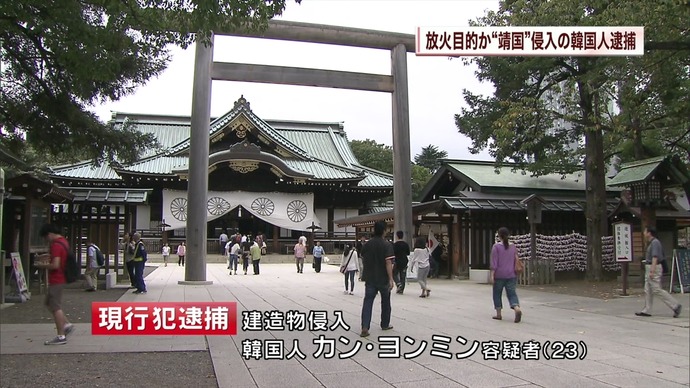 靖国神社(東京都千代田区)に不正に侵入したとして、警視庁公安部は建造物侵入の現行犯で、韓国籍の無職、カン・ヨンミン容疑者(23)を逮捕した。公安部によると、容疑を認めている。