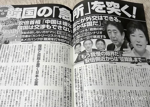 この週刊誌は14日に発売された11月21日号に掲載した『韓国の急所を突く』と言う特集記事で、安倍総理周辺の消息筋を引用してこのように伝えた。