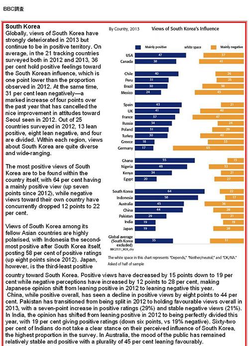 世界中から韓国がどのように思われているのか? それを調査したBBCの結果が興味深かったので取り上げたいと思う。その内容は各国の人が韓国をポジティブに思っているかネガティブに思っているか回答したもの。要するに好きか嫌いかである。
